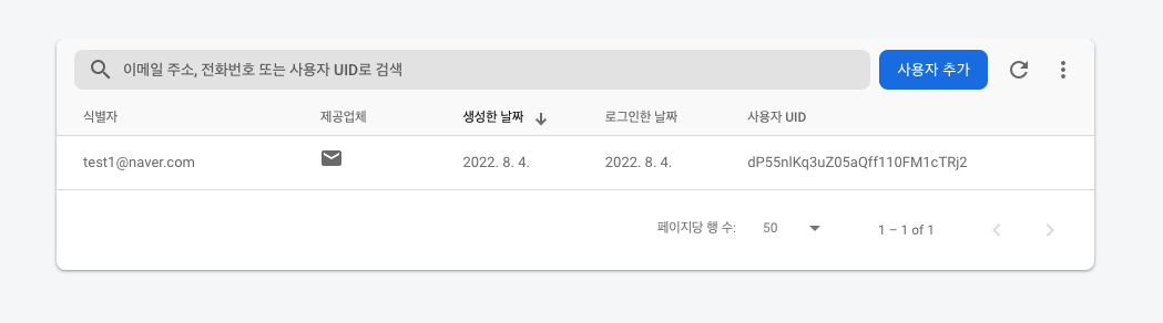 test1@naver.com이라는 이메일로 회원가입을 시도했고 콘솔에는 객체 하나가 만들어진 듯 해보인다. Firebase Authentication으로 이동하여 잘 추가가 되었는지 확인해보자.