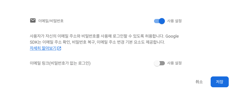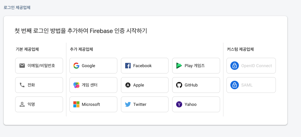 시작하기 버튼을 누르면 이 페이지를 보고 있을 것이다. 지금은 이메일/비밀번호 기능만 사용할 것이므로 이메일/비밀번호 버튼을 누른다.