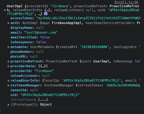 onClickEnroll을 만들어 회원가입 버튼을 눌렀을 때 유저가 입력한 아이디와 비밀번호로 회원가입을 진행하고 콘솔로 확인해봅시다.
