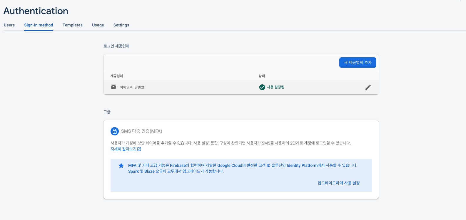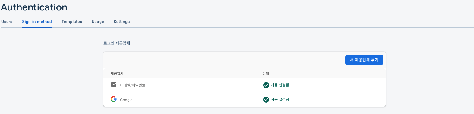 1-2 현재는 이메일/비밀번호만 사용 설정이 되어있는데 새 제공업체 추가 버튼을 눌러 추가하자.